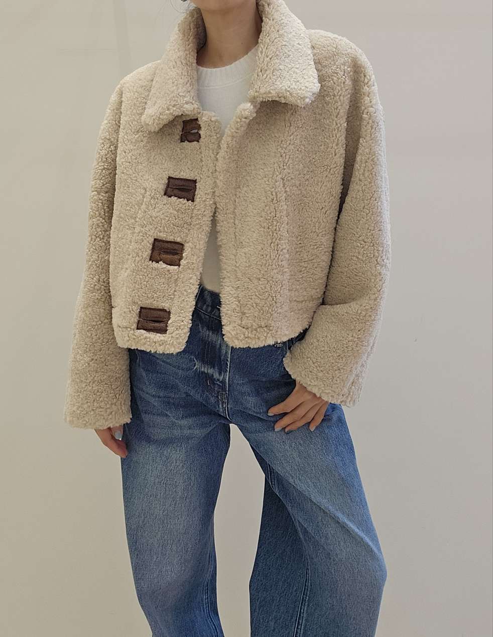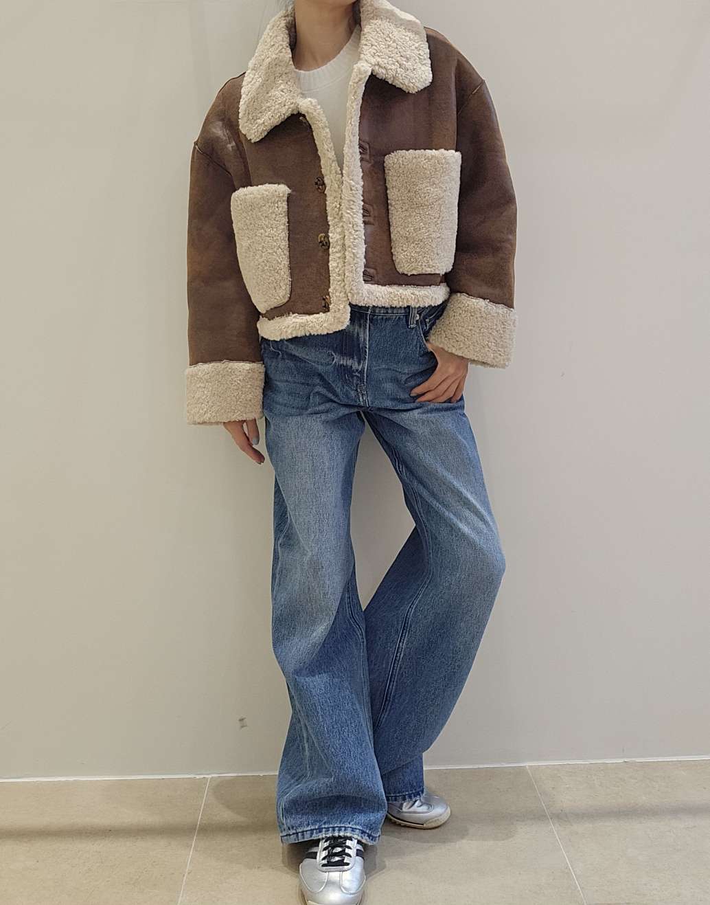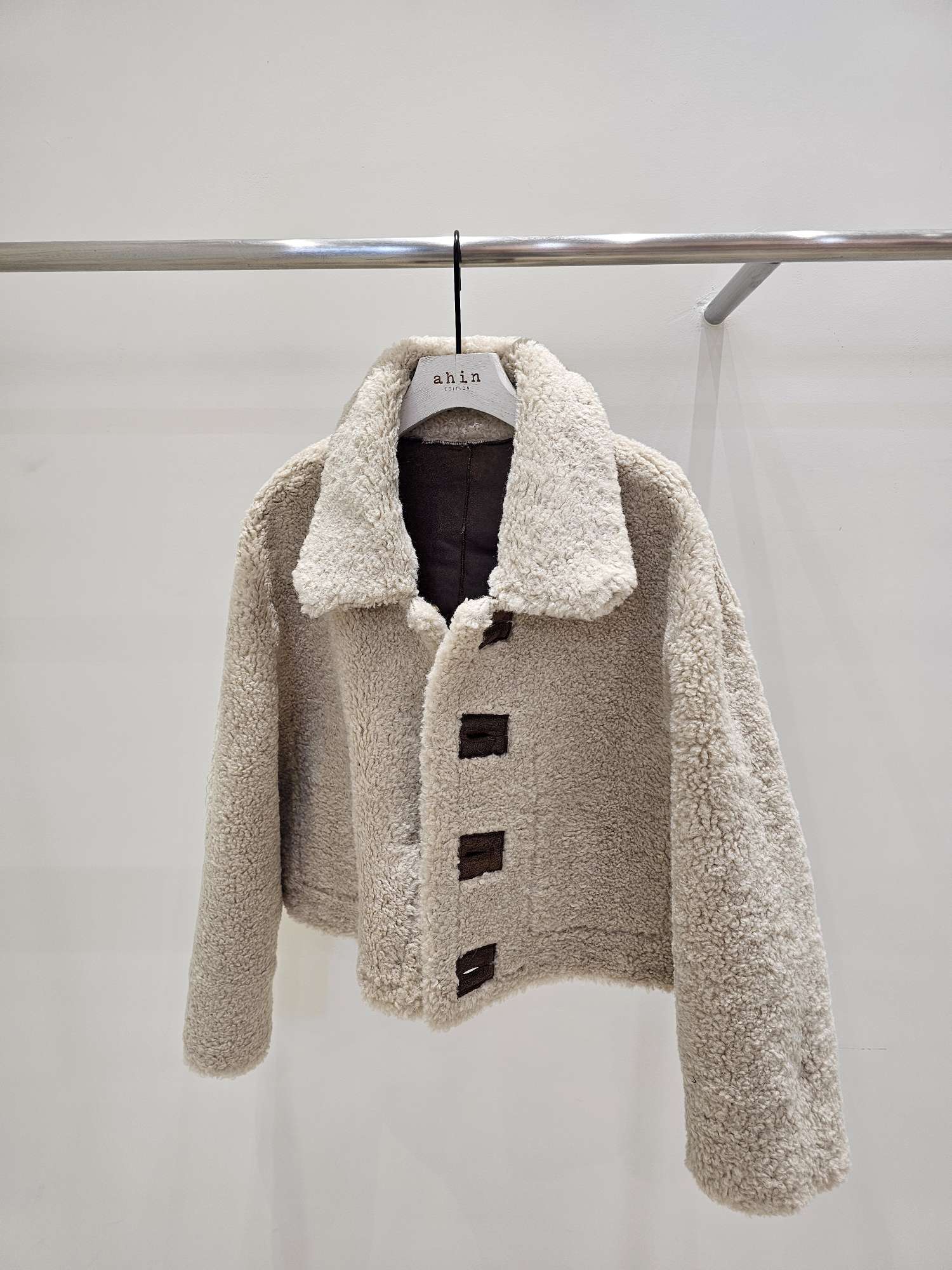 리버시블 가능한 크롭기장의 무스탕쟈켓입니다 翻译