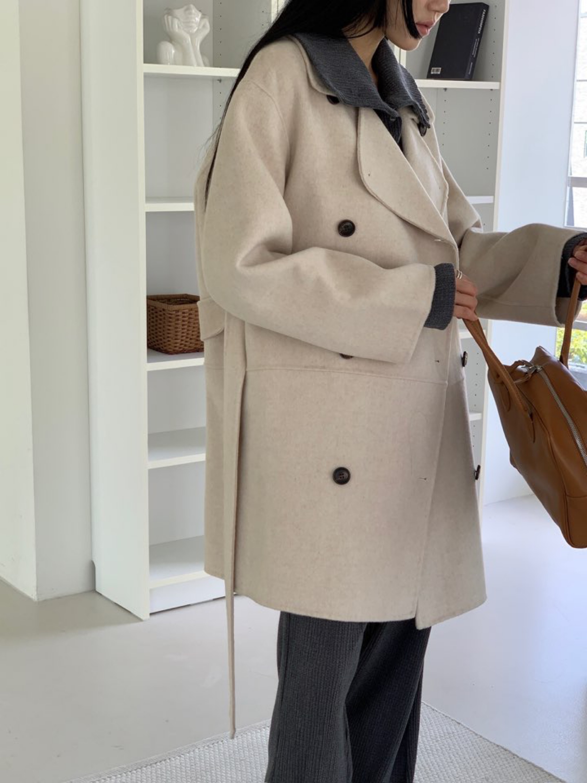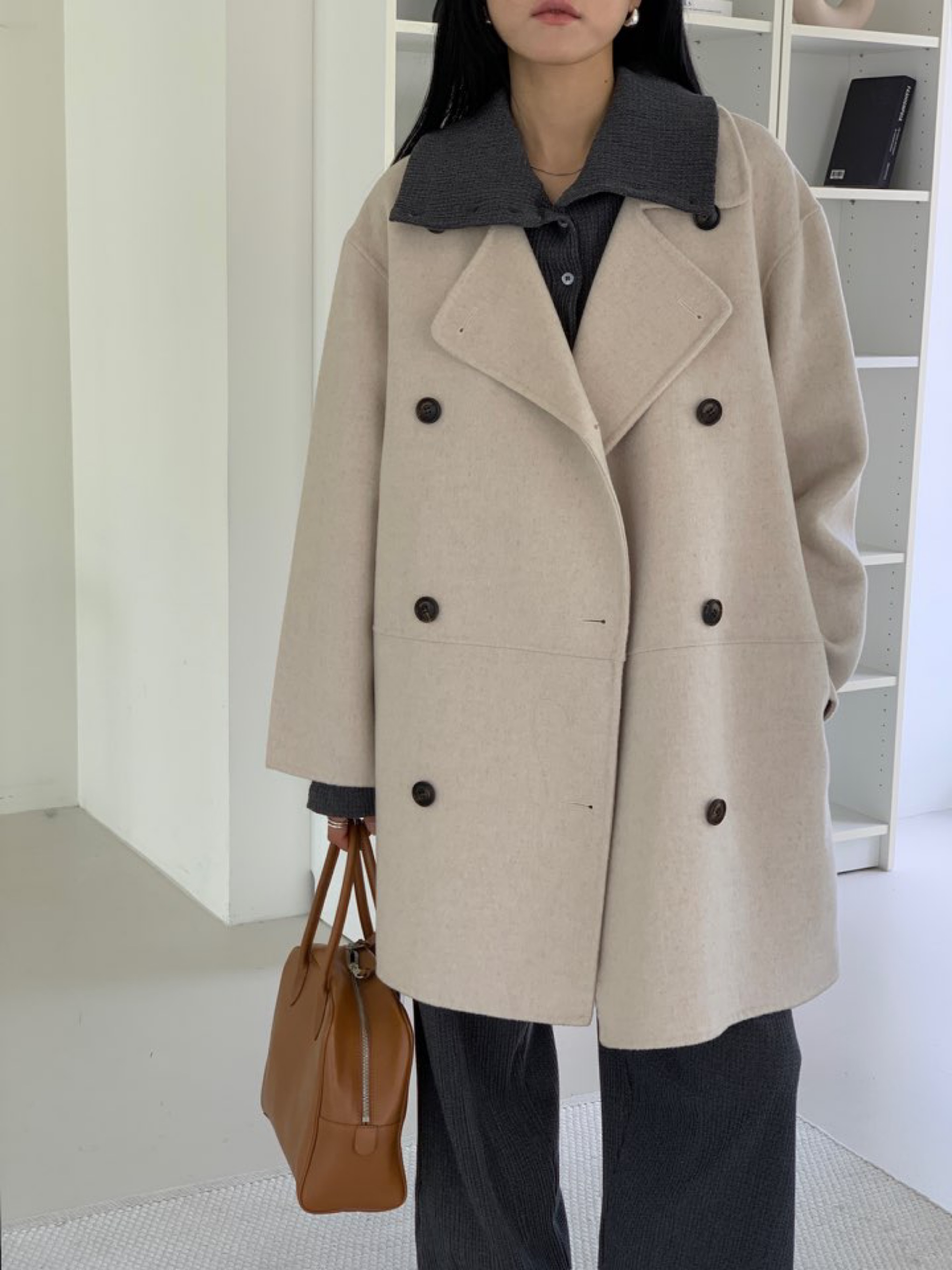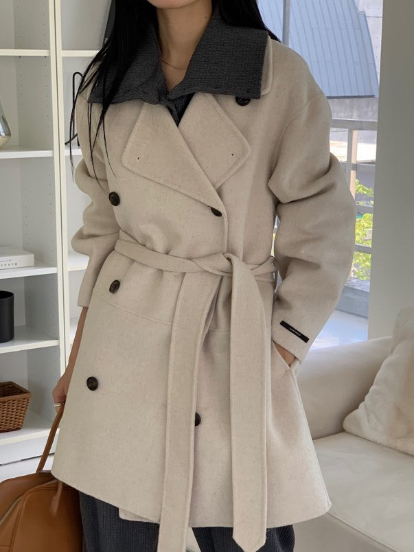 *캐쥬얼한 무드의 하프 기장감의 노치드카라 핸드메이드 더블코트