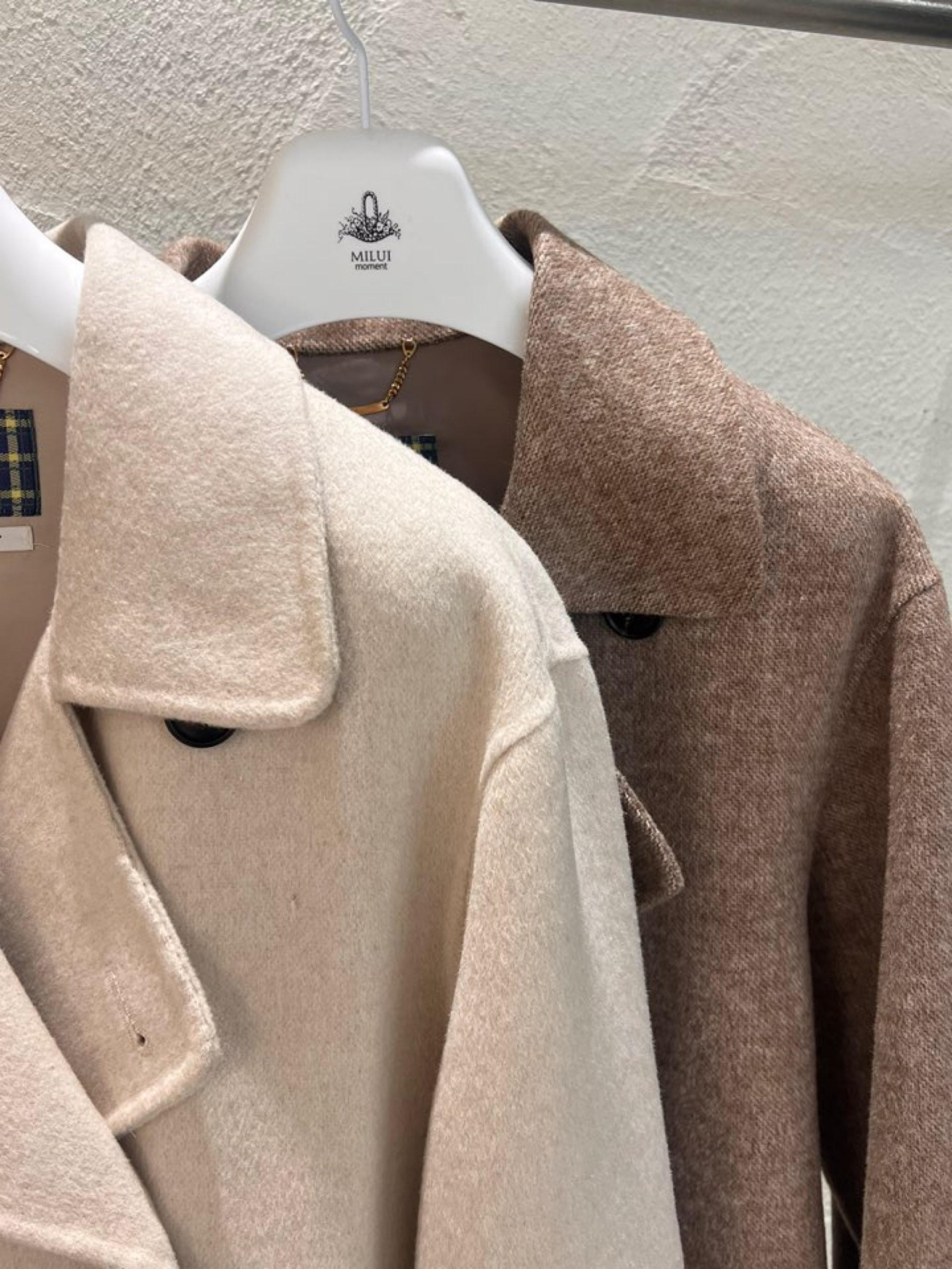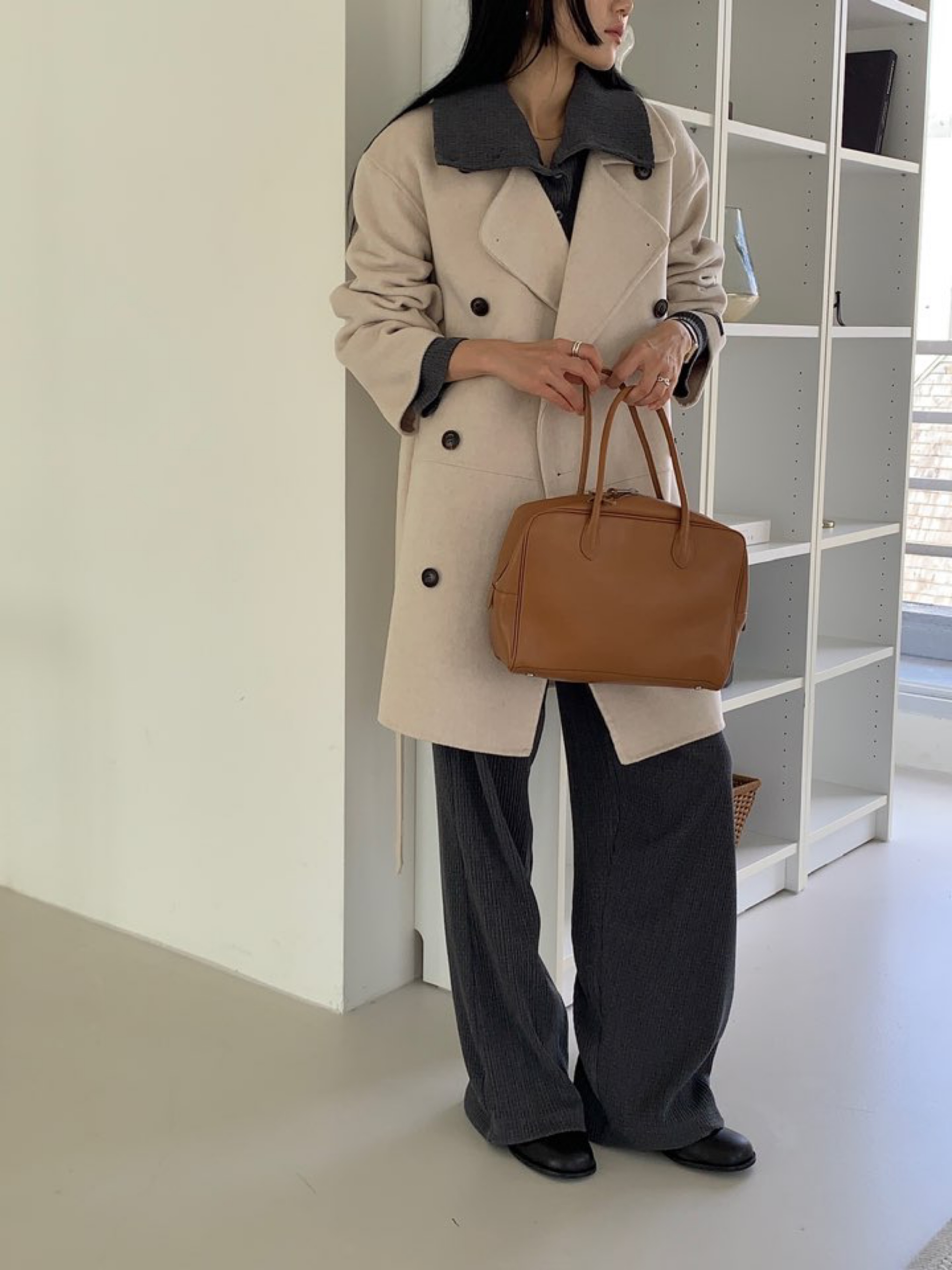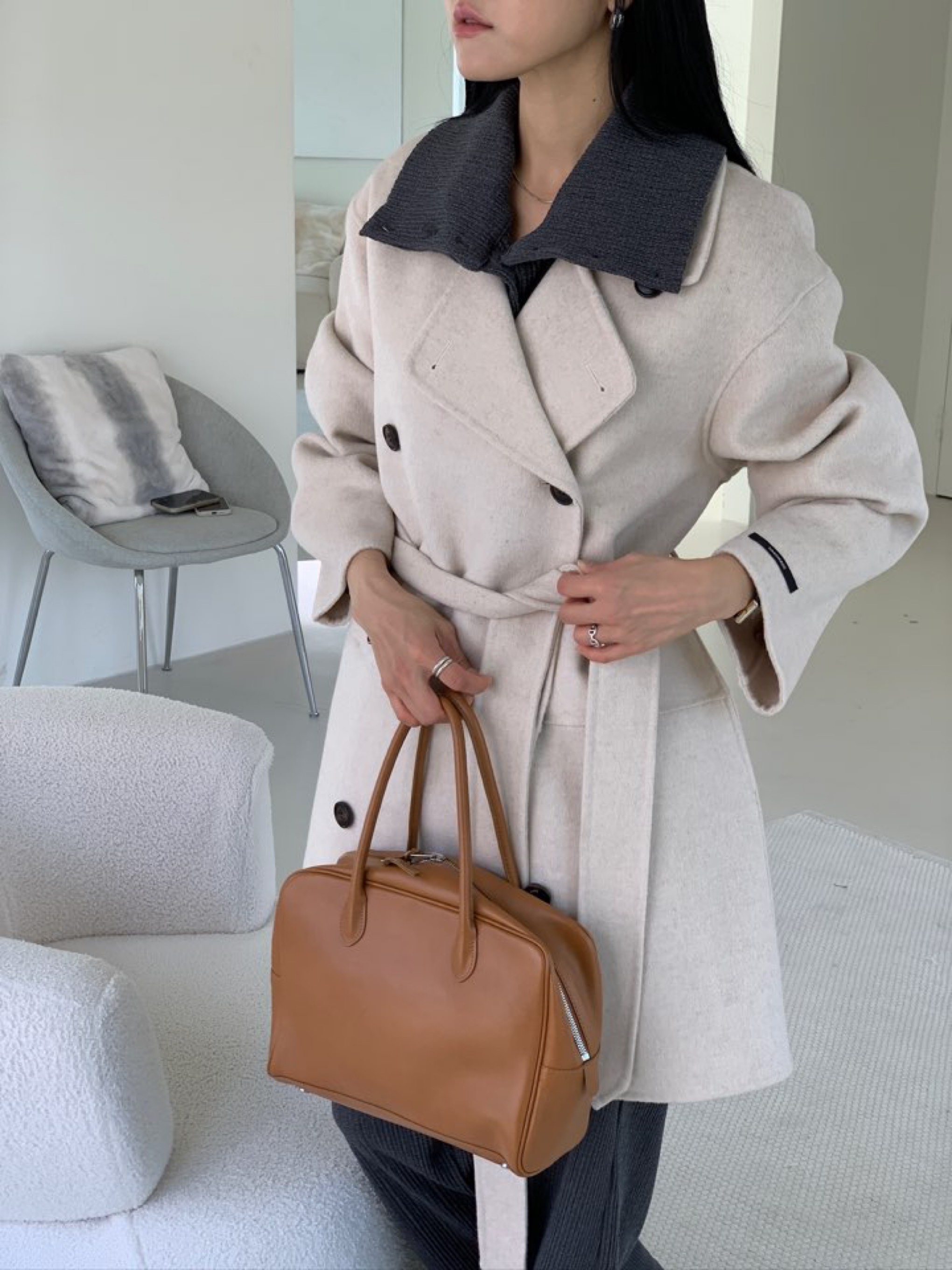 *캐쥬얼한 무드의 하프 기장감의 노치드카라 핸드메이드 더블코트