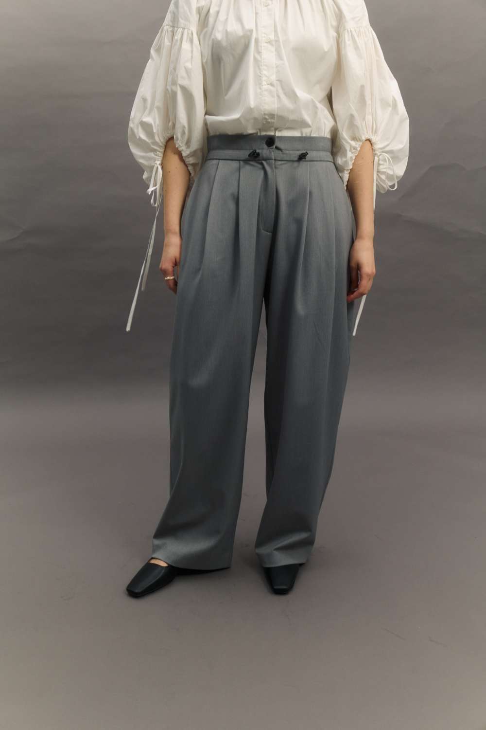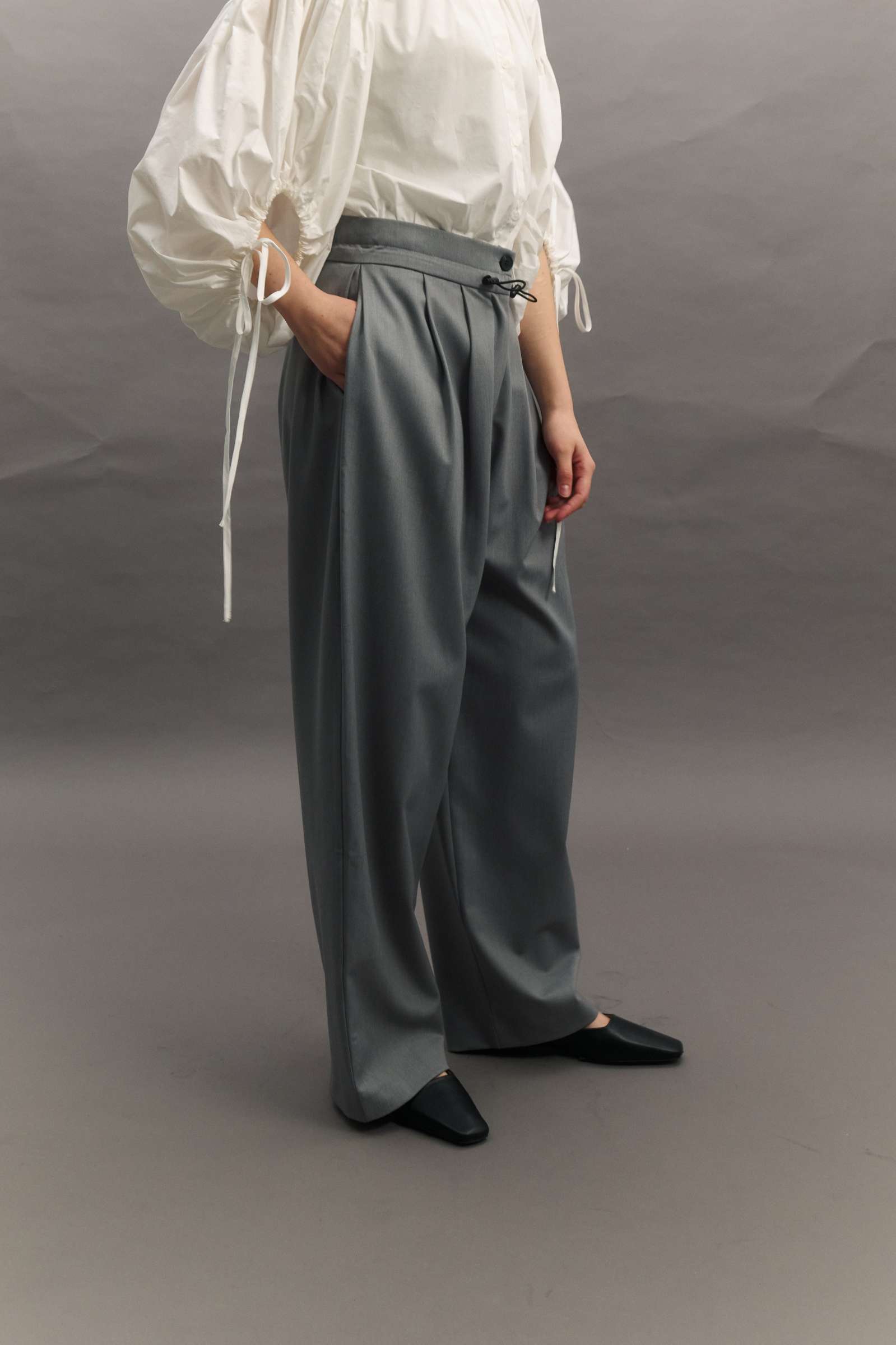 허리스트링과 핀턱 디테일이 유니크한 슬렉스입니다 翻译