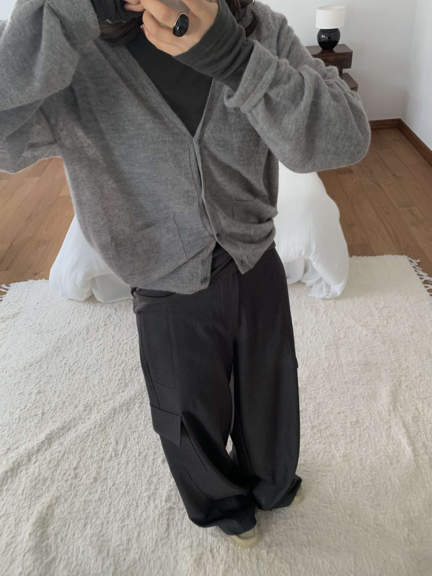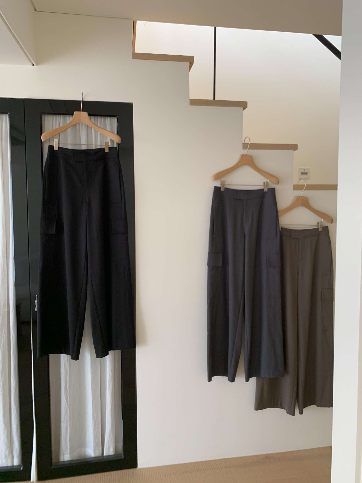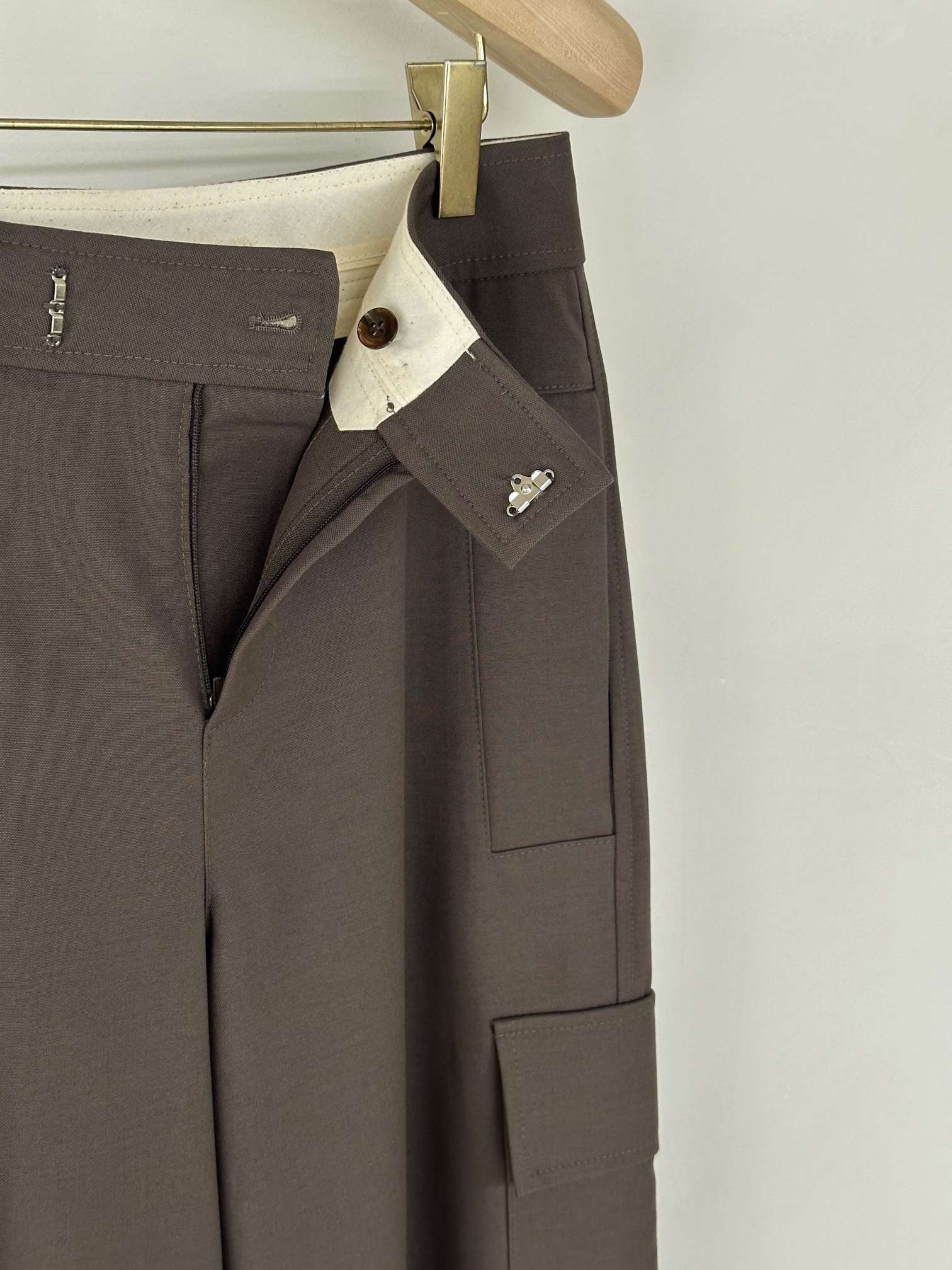 밀리터리 느낌의 디테일들을 가지고 드레이프성이 좋은 울 혼방 소재로 만들어 재미난 매력을 가진 카고 트라우저에요