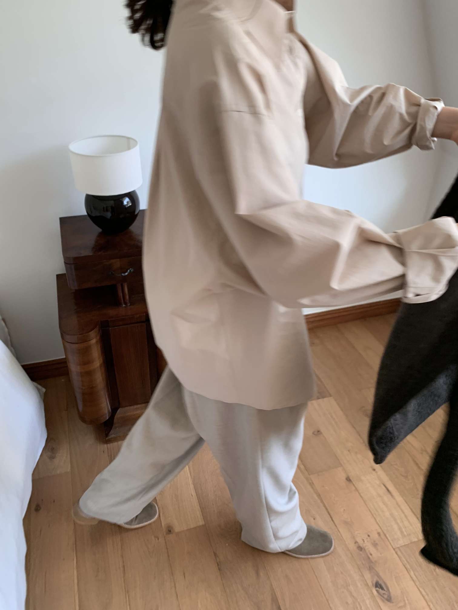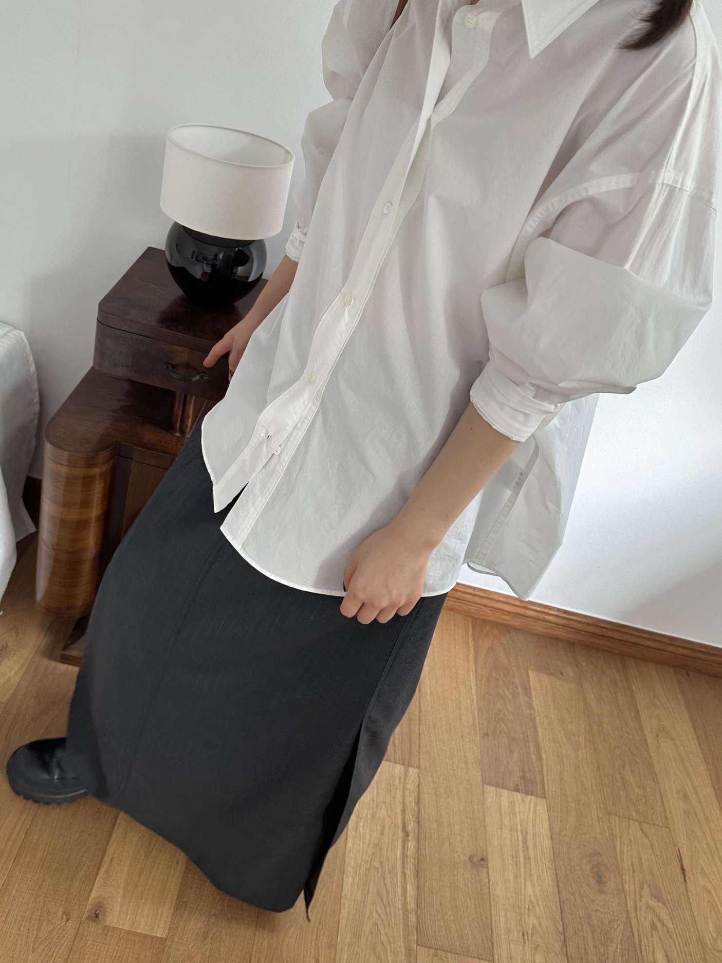 같은 톤의 탑스티치 봉제, 소재에서 오는 자연스러운 드레이프가 박시한 패턴과 만나 오버사이즈 실루엣의 감도를 높혀주며 고급스러운 천연 자개단추로 마무리했어요 翻译