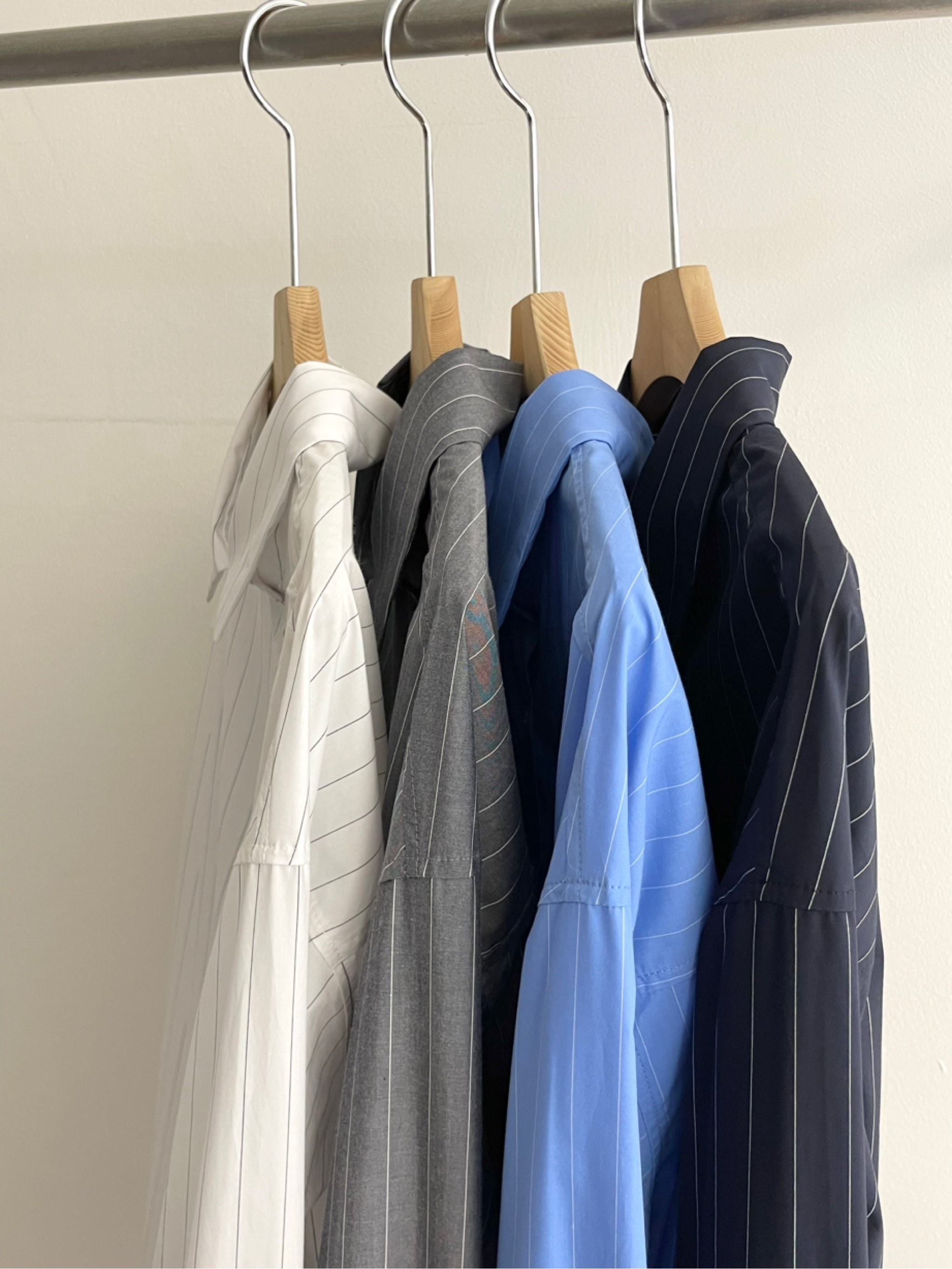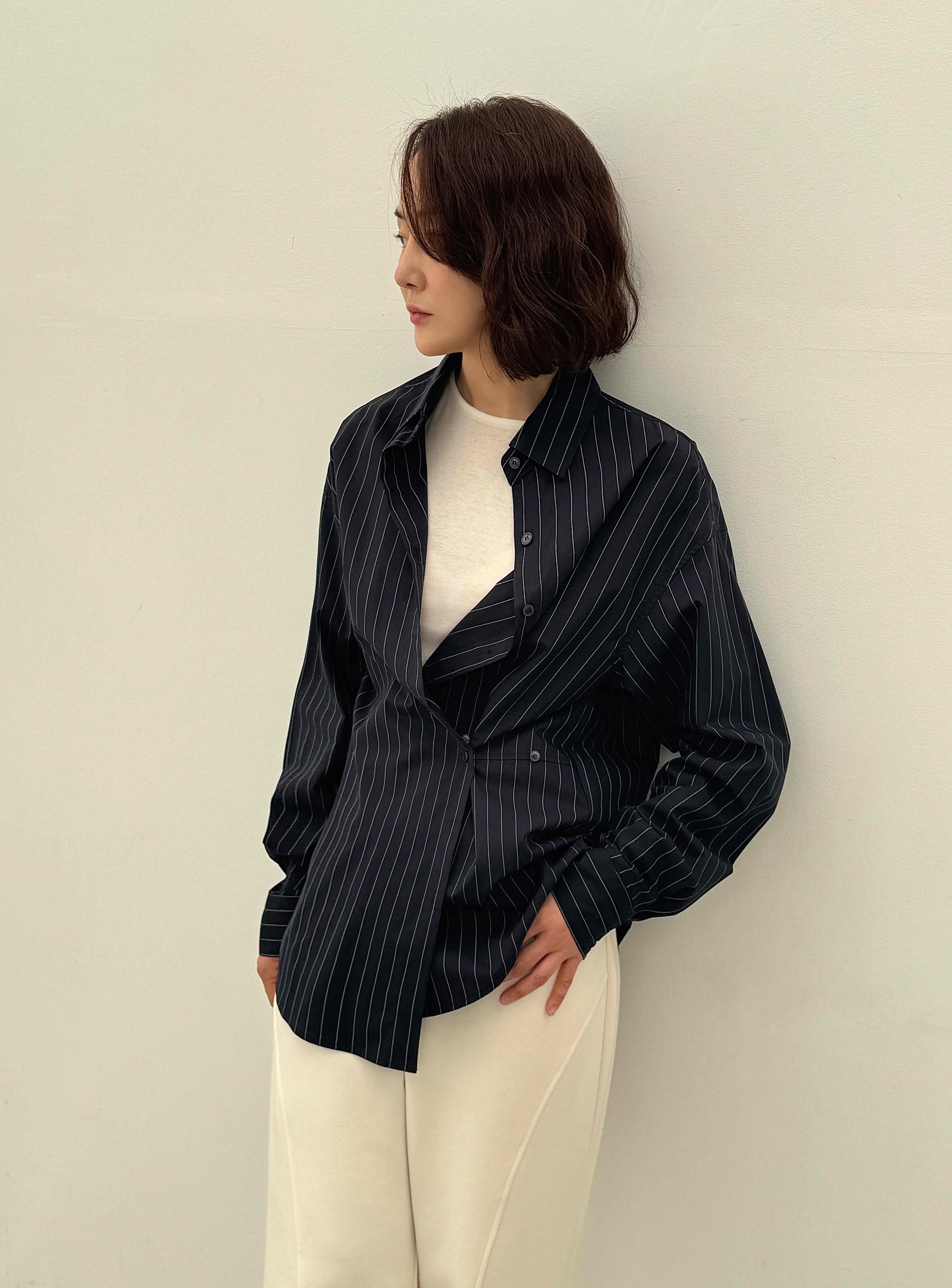 설명: 스트라이프 오버핏 셔츠. 투웨이. 사선 단추 디테일로 언발 디자인 연출 가능. 레이어드 상품으로 활용도 높음. 独特的不对称纽扣设计. 可以和别的上衣层叠着穿. 翻译
