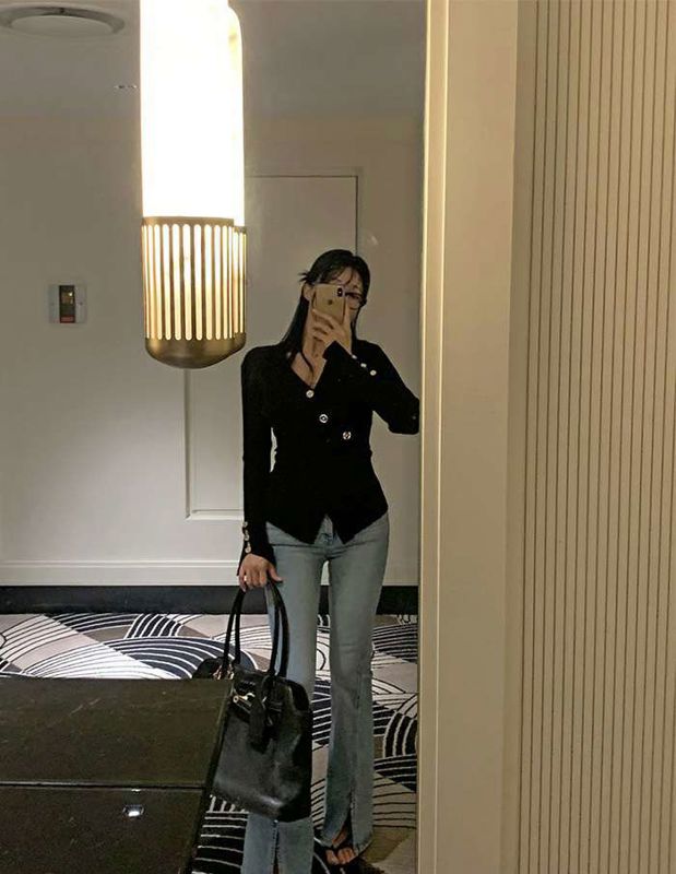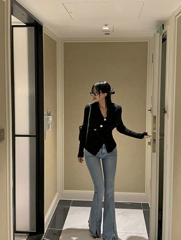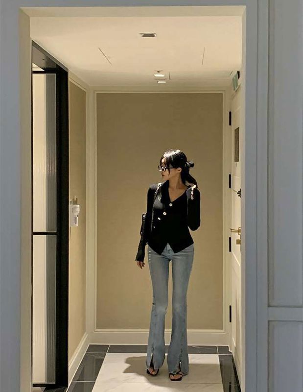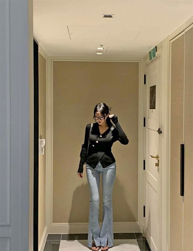 修身侧开叉喇叭牛仔裤니즈 레직기 롱 부츠컷 데님