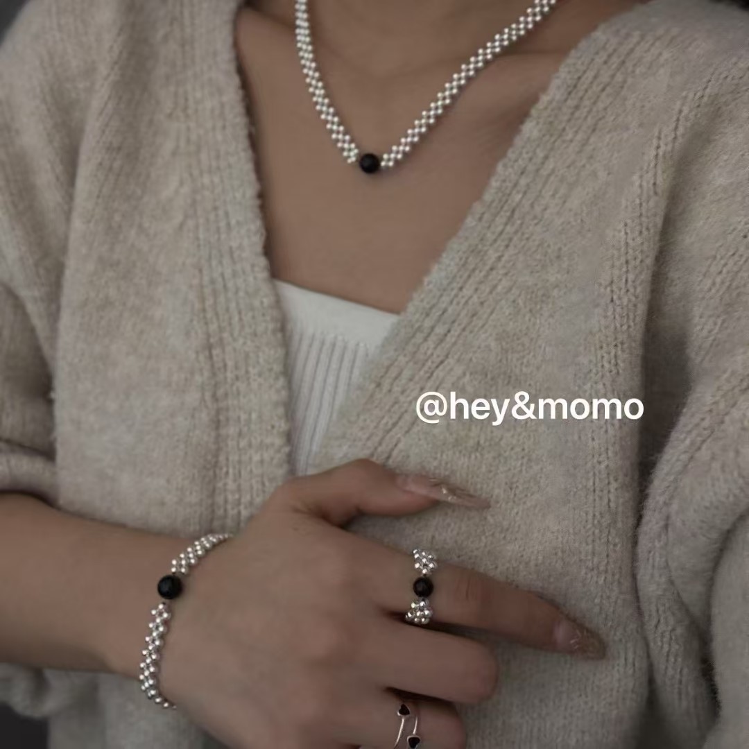 图款 ⚪️925 银 银球黑玛瑙手工编织 弹力绳戒指 12000