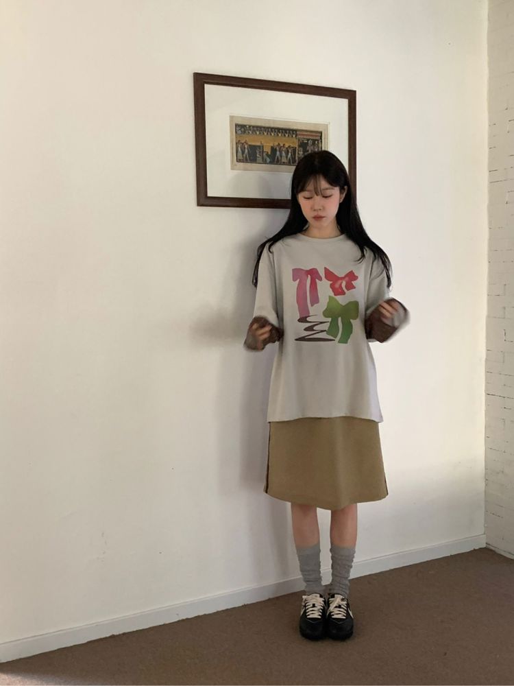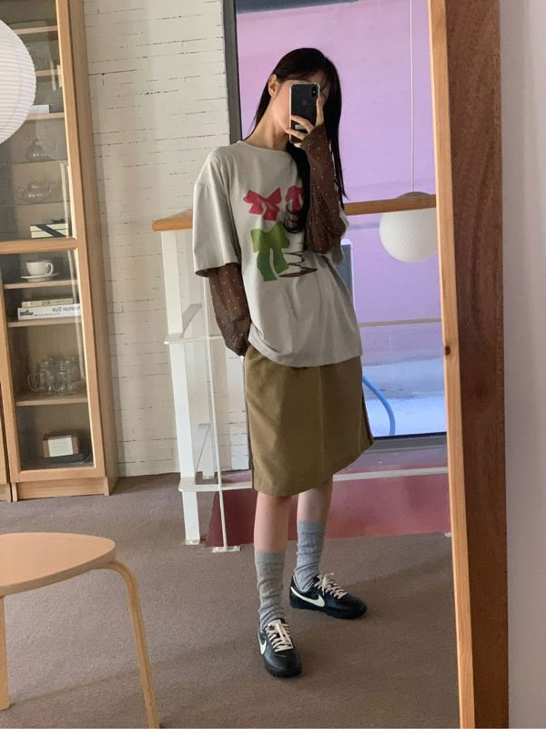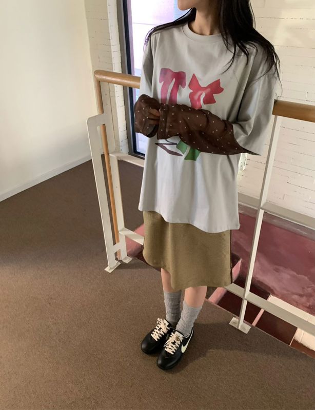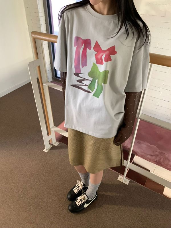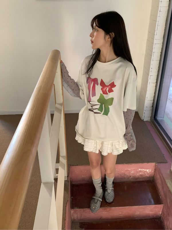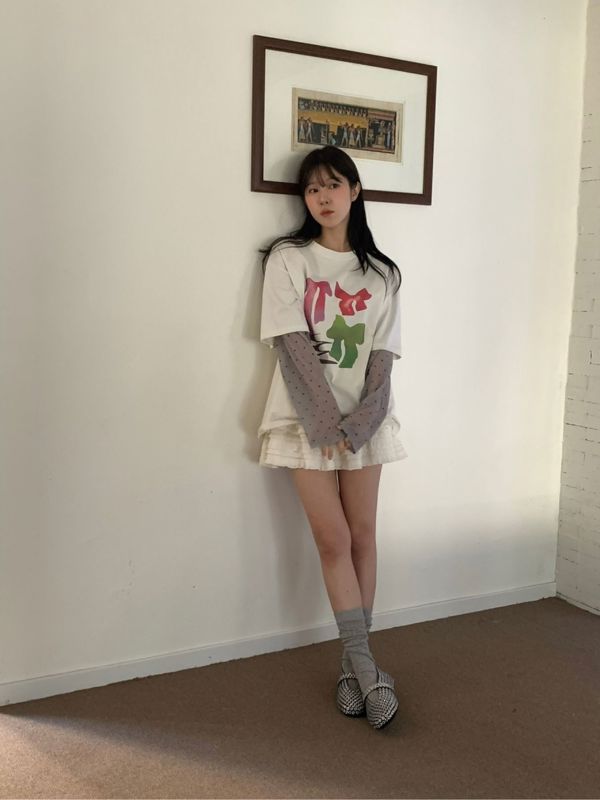 东大门设计感蝴蝶结波点假两件t恤
