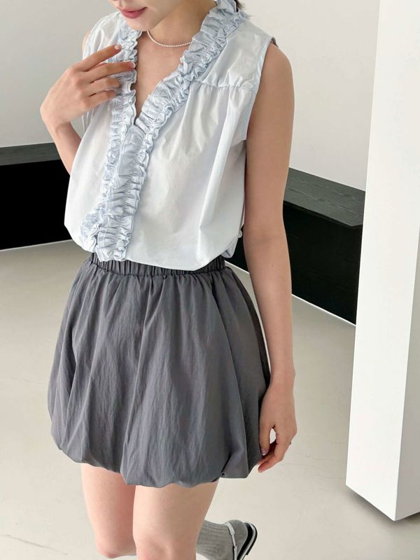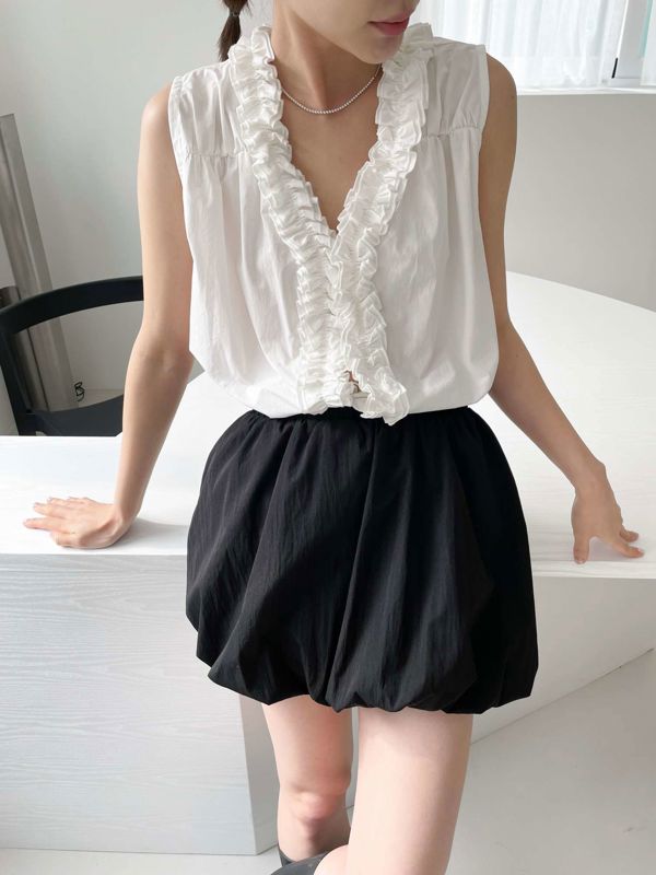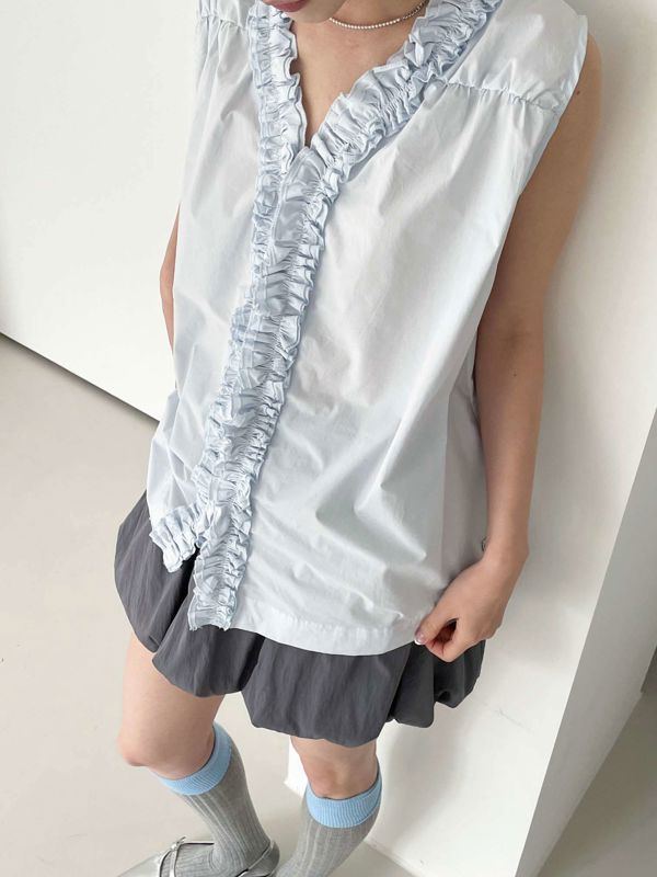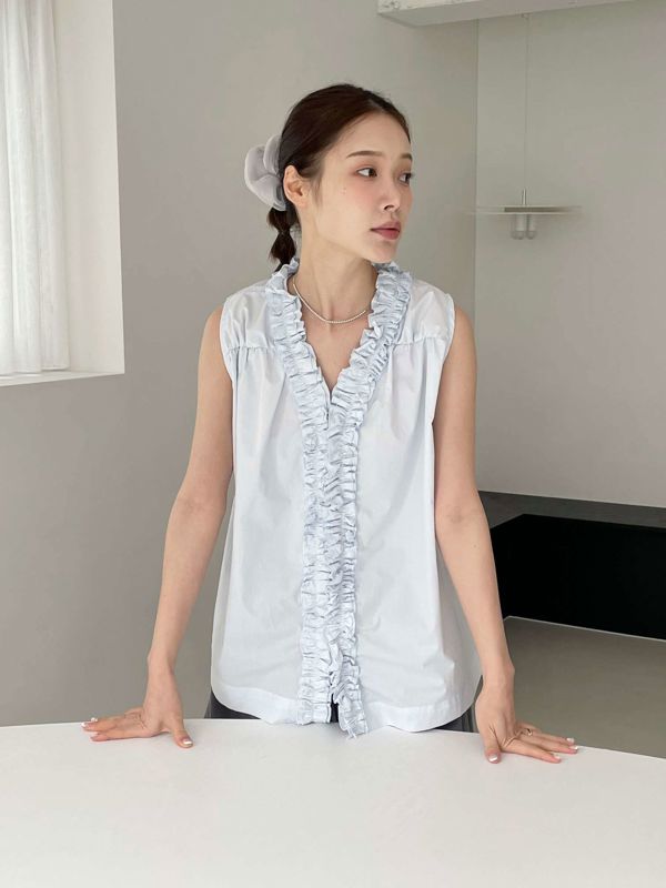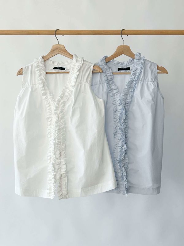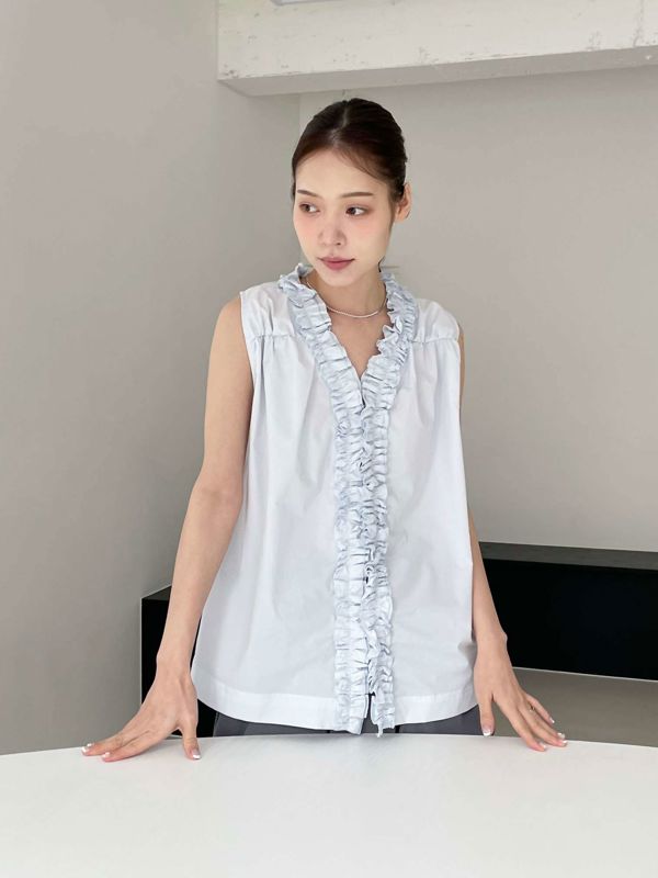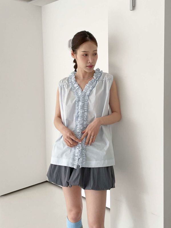 올해 트렌드인 프릴이 입체감있게 잡힌 나시 블라우스입니다 翻译