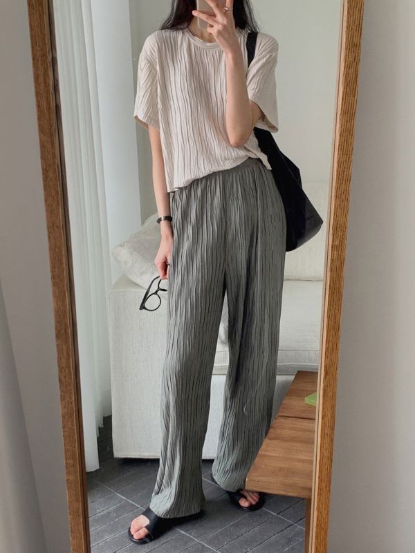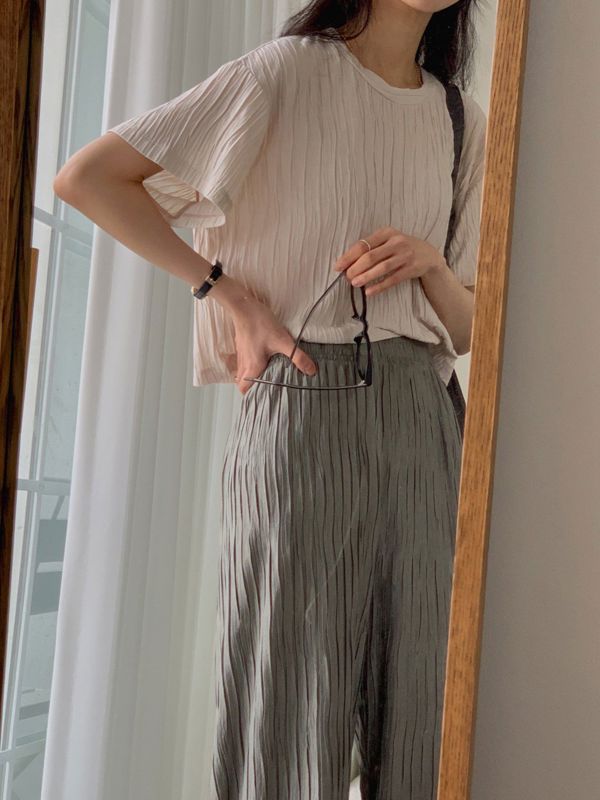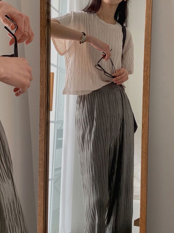 1. 디자인: 수직 플리츠 패턴이 전체적으로 들어간 독특한 텍스처의 티셔츠로, 일반 티셔츠보다 고급스러운 느낌을 줍니다.