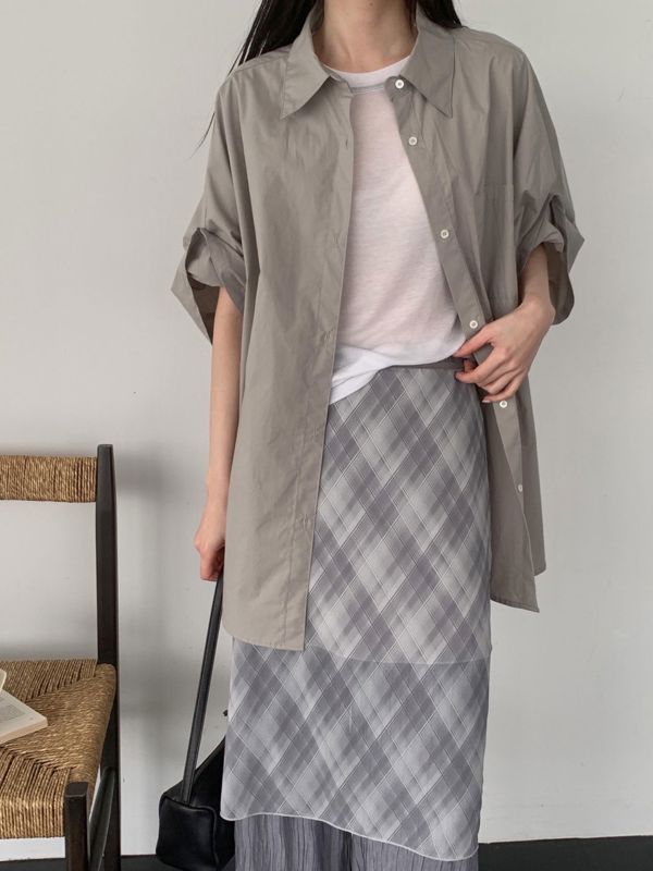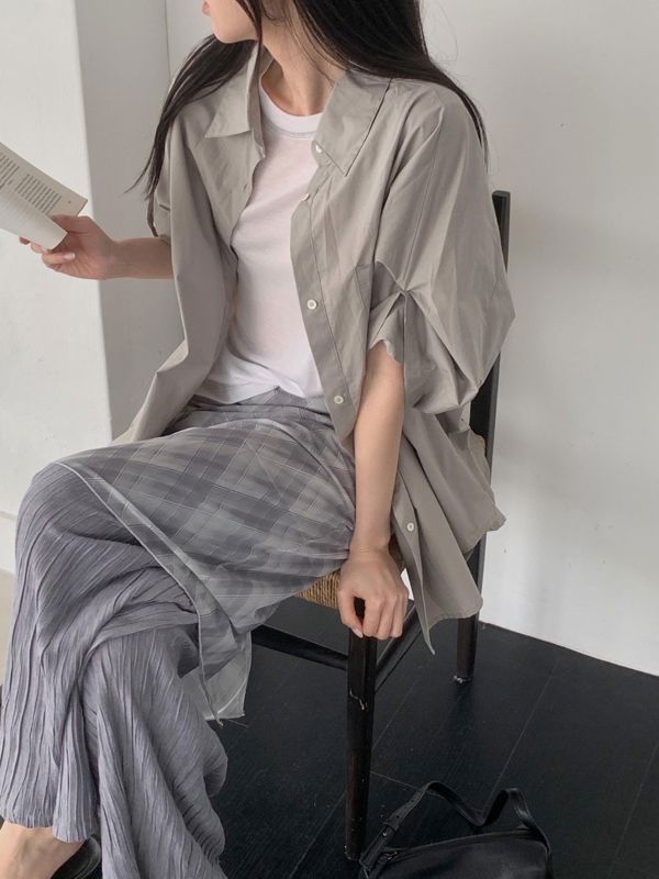 소매 롤업이 포인트 연출로 깔끔하고 세련된 오버사이즈 반소매 셔츠입니다. 제품의 상세 정보와 특징을 다음과 같이 설명드립니다: