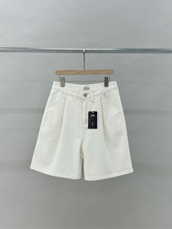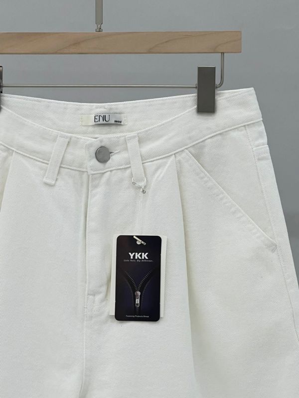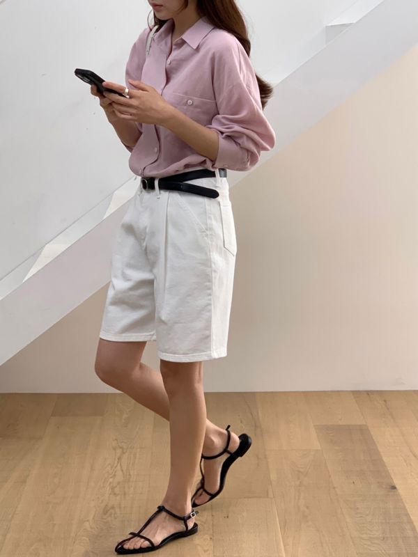 깔끔한 실루엣과 탄탄한 퀄리티가 돋보이는 화이트 반바지를 입니다