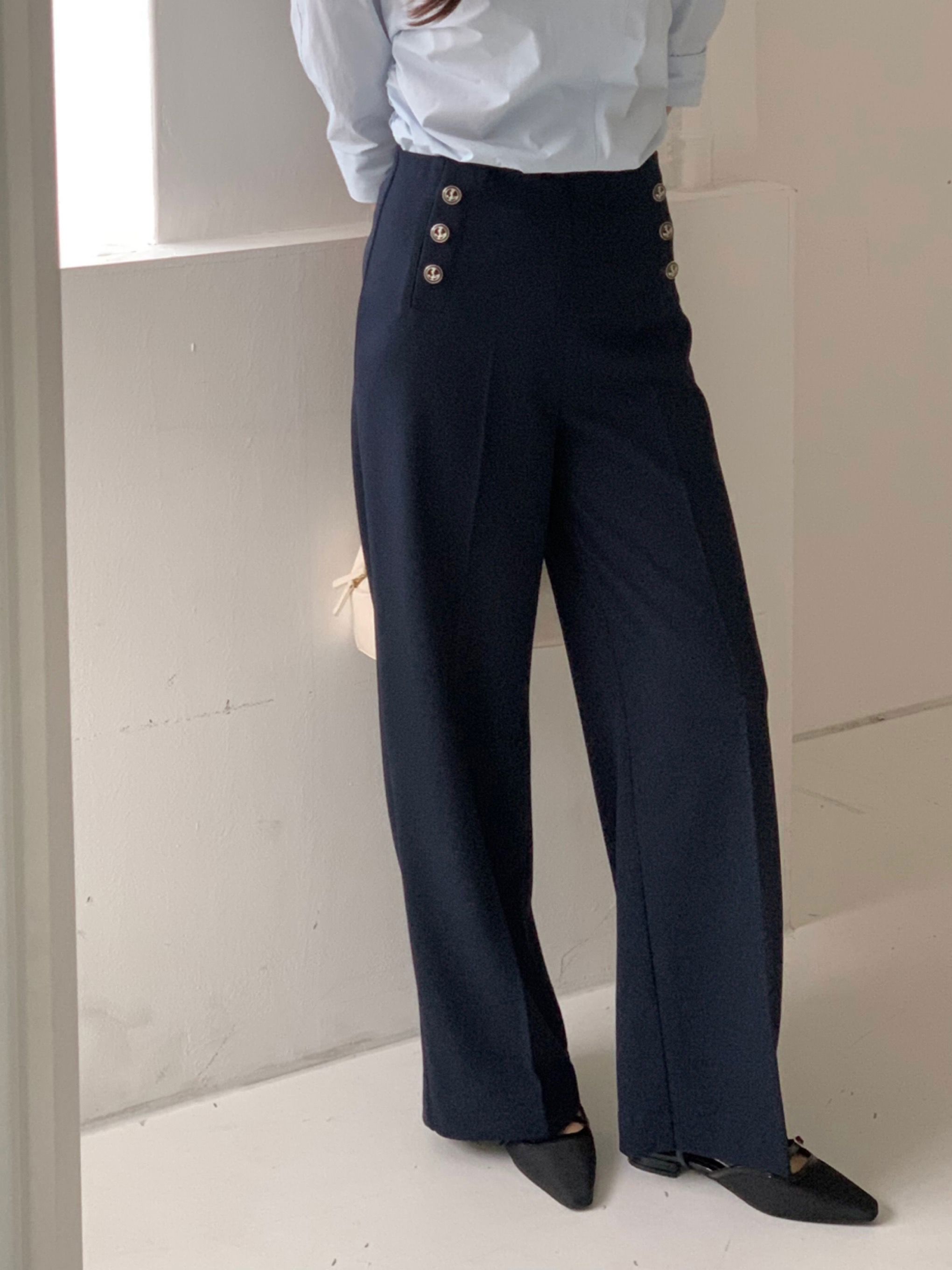 하이웨이스트 디자인에 양쪽으로 더해진 버튼 디테일이 시선을 자연스럽게 끌어줘, 단정하면서도 포인트 있는 룩을 완성해줍니다.