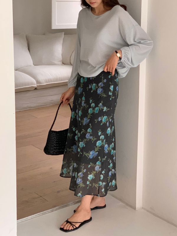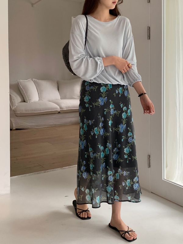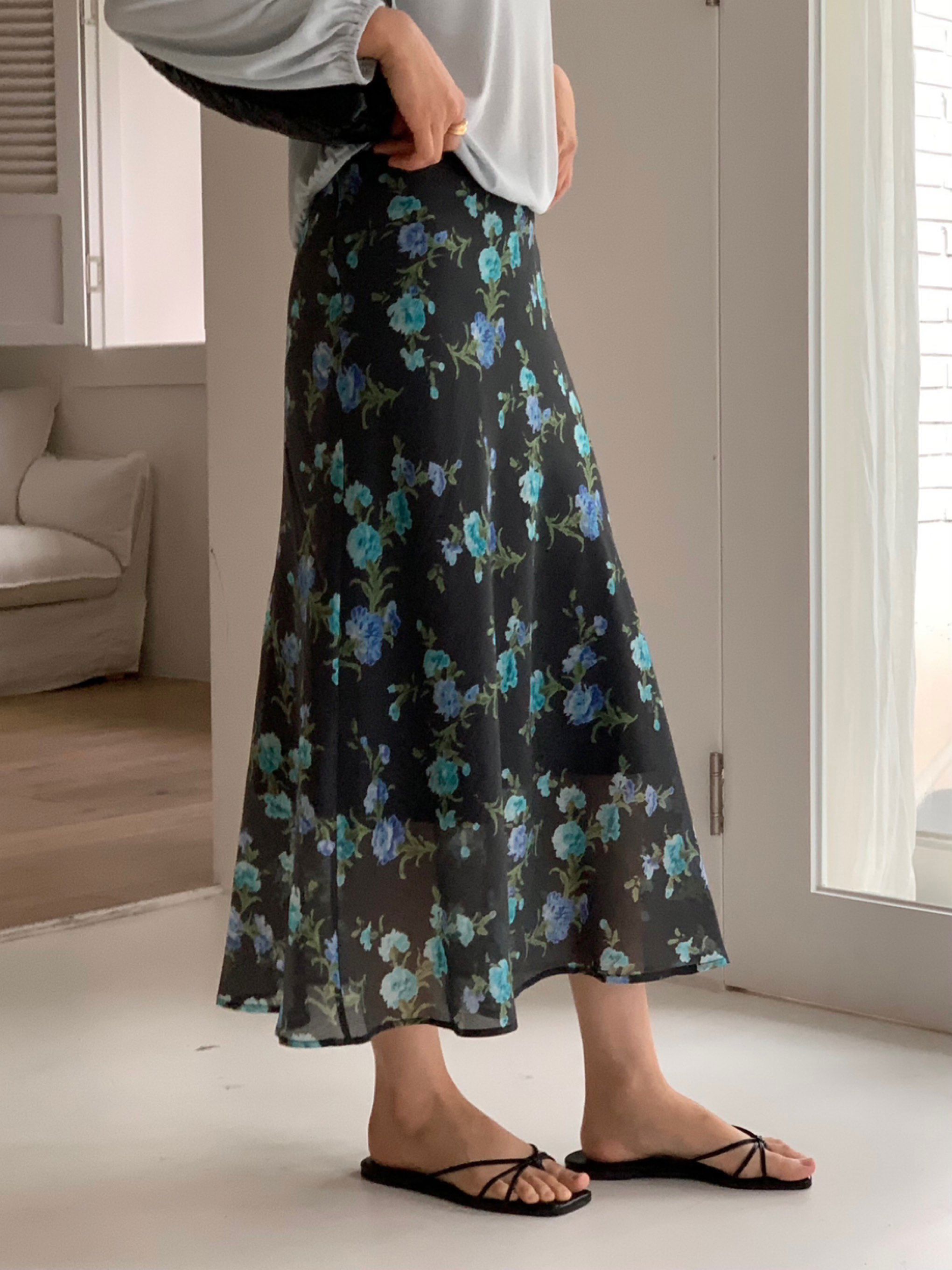 텐셀과 폴리 혼방 원단으로 제작되어 은은한 광택과 찰랑거리는 핏이 돋보이는 플로럴 스커트입니다.