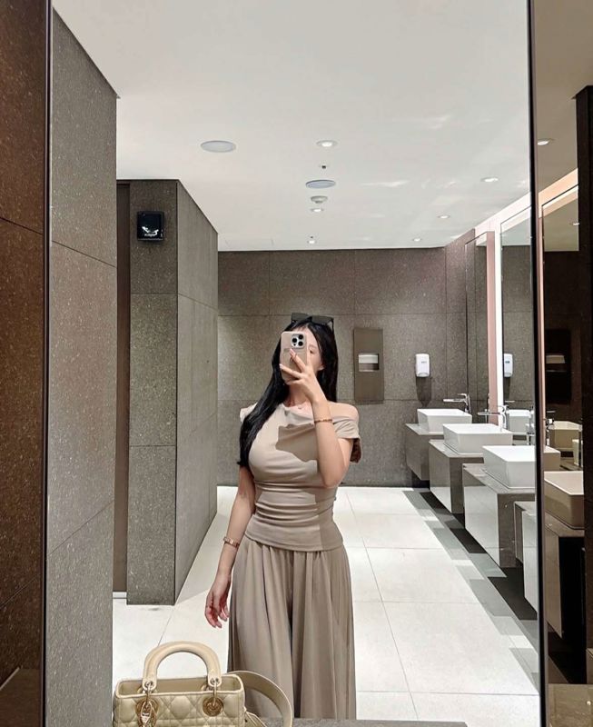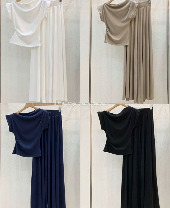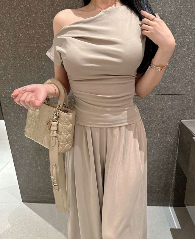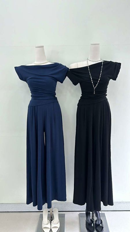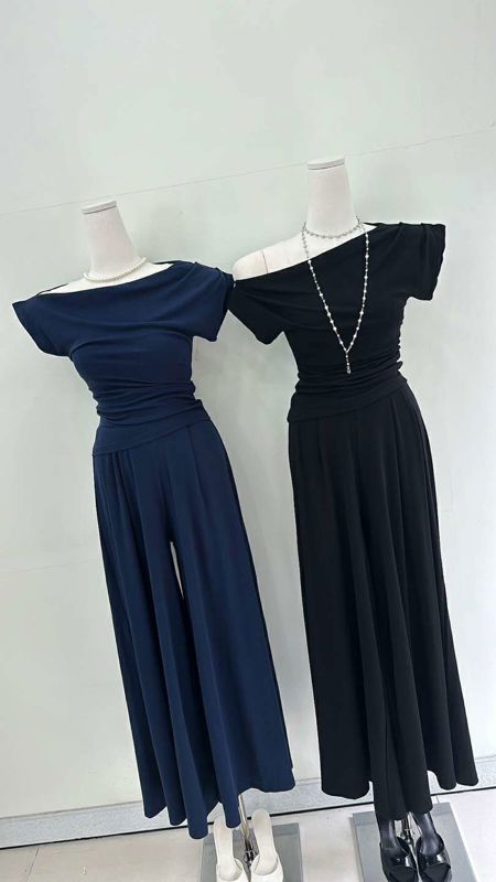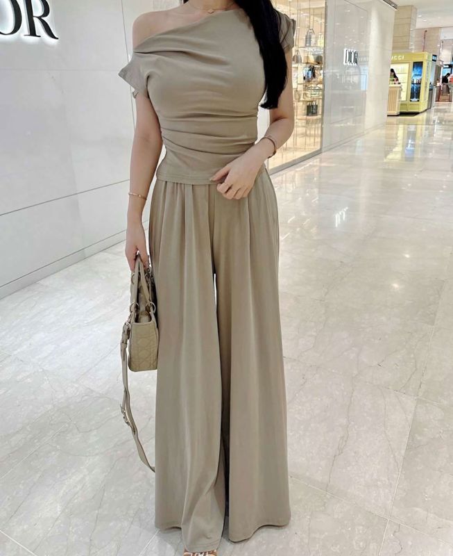 一字肩短袖阔腿裤套装메르시 드레이프티 핀턱 와이드팬츠