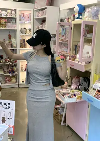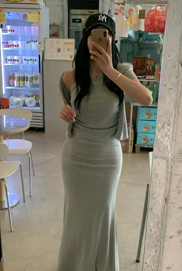假两件短袖鱼尾裙套装크림 홀터 반팔 가디건&머메이드스커트셋트