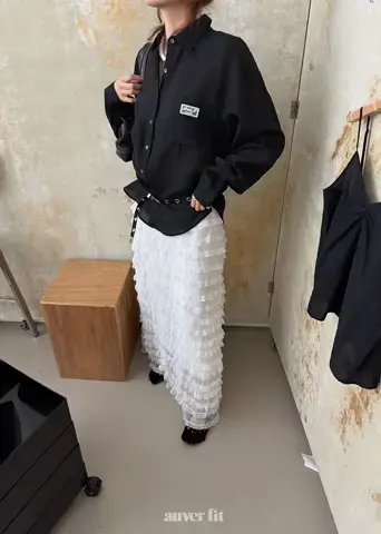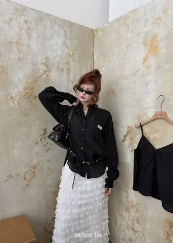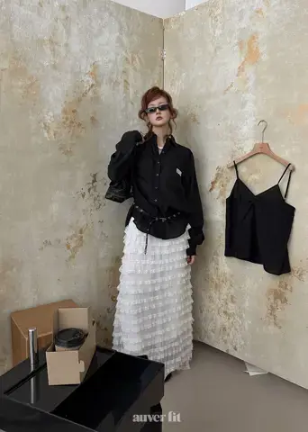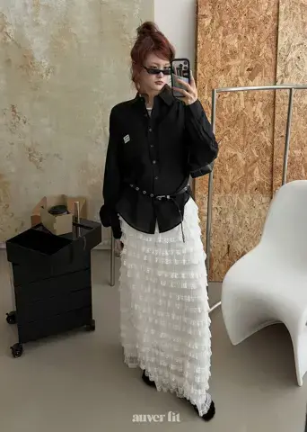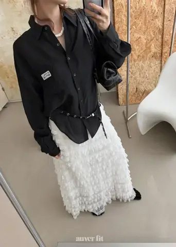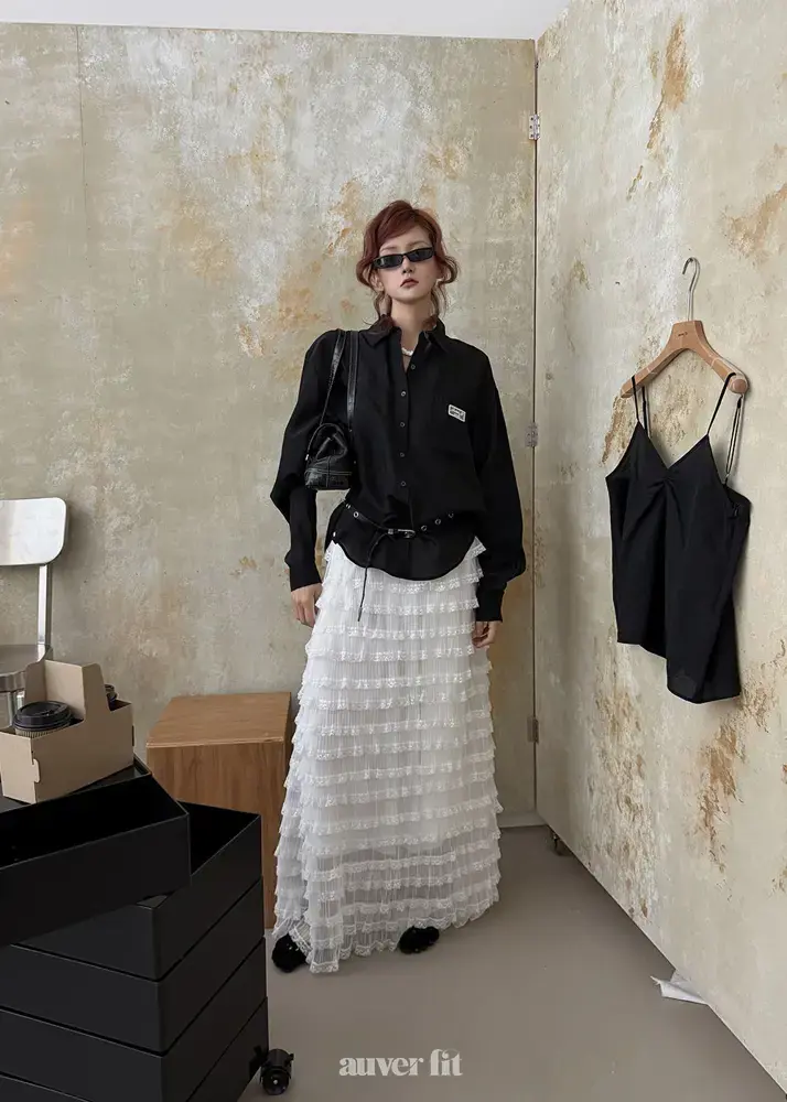 Sự kết hợp giữa áo sơ mi đen bóng bẩy và chân váy xòe ren tạo nên một phong cách tinh tế nhưng đầy cuốn hút.