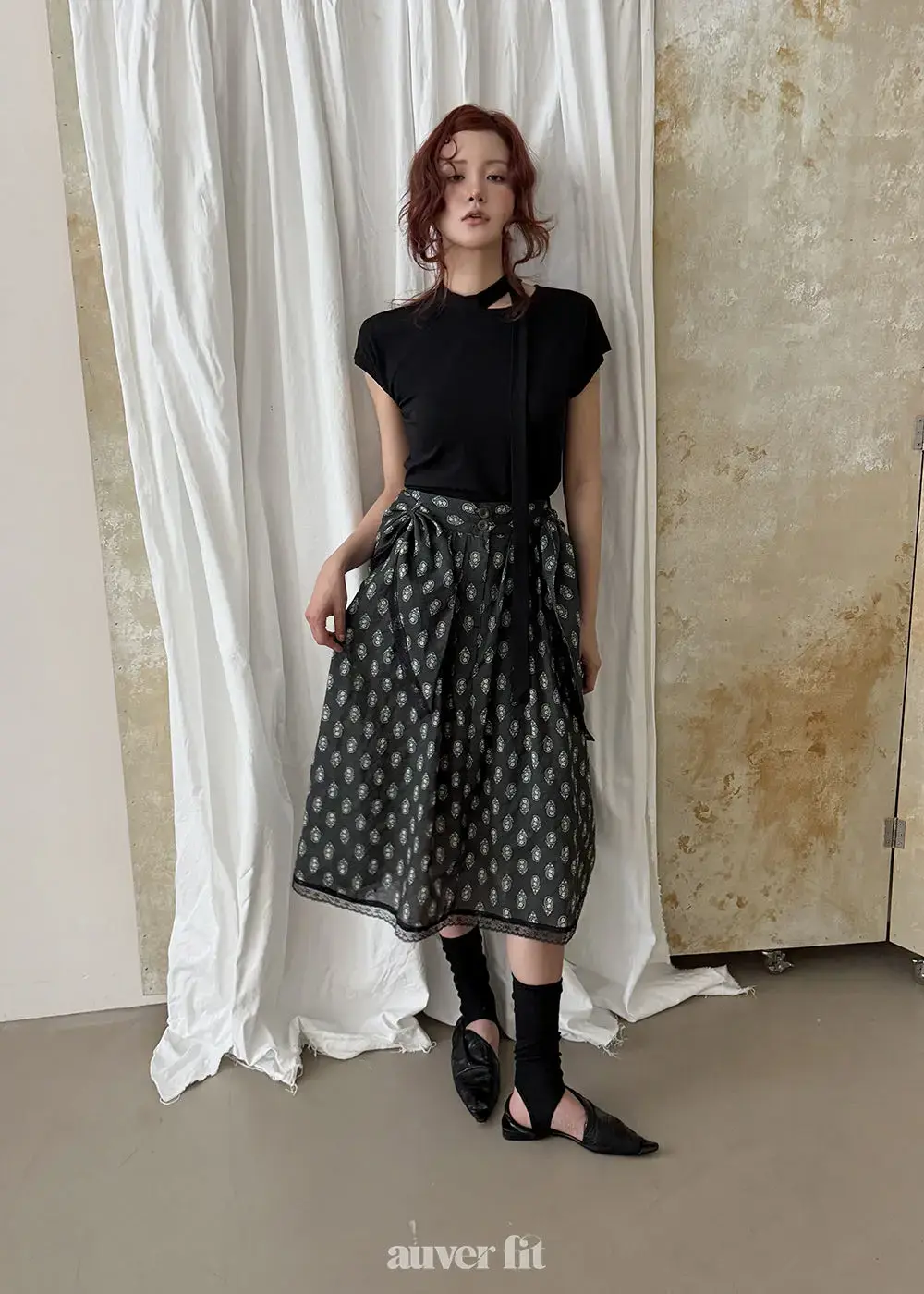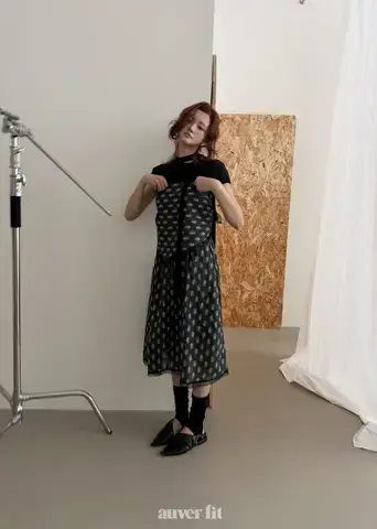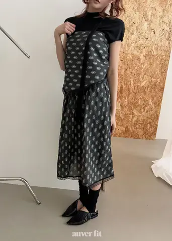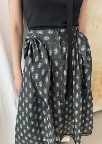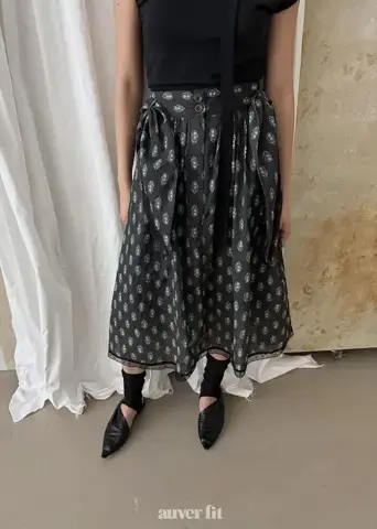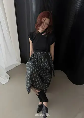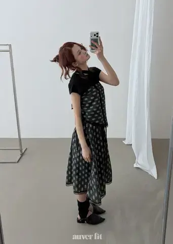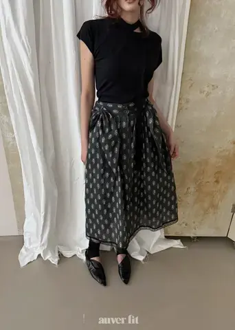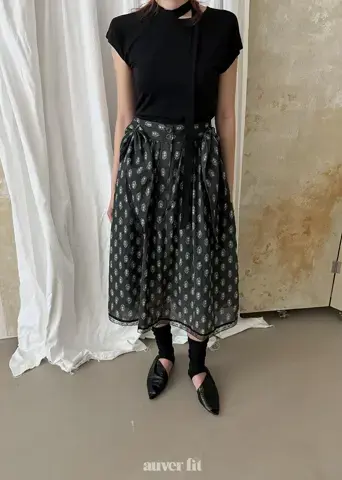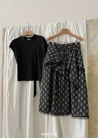Mẫu hoa văn paisley phức tạp và các chi tiết xếp lớp tạo ra một bầu không khí sang trọng. Áo phông và váy hài hòa hoàn hảo, mang lại cảm giác tự do như thể chúng là một bộ đồng nhất. Sự kết hợp của tông màu đen đơn giản với những chi tiết tỉ mỉ làm cho nó