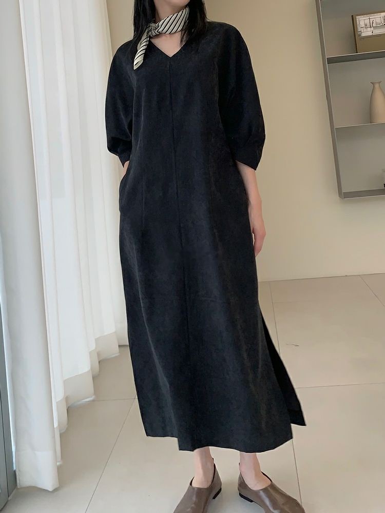 카라 주름 버튼 니트 롱원피스 . 데일리 베이직 니트 롱 OPS